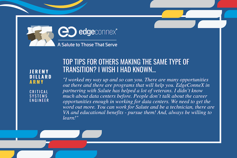 As part of our continuing mission of honoring and recognizing our amazing veteran employees, EdgeConneX, in partnership with Salute Mission Critical, launched EdgeConneX Salutes 2022. As a longtime partner of EdgeConneX, Salute uniquely addresses our critical infrastructure facility management needs. Salute’s skilled veteran labor force works alongside our EdgeConneX teams, which include dedicated and hard-working veterans like Jeremy Dillard. We are proud to share Jeremy’s experience with you. Please read his Q&A below to learn more.