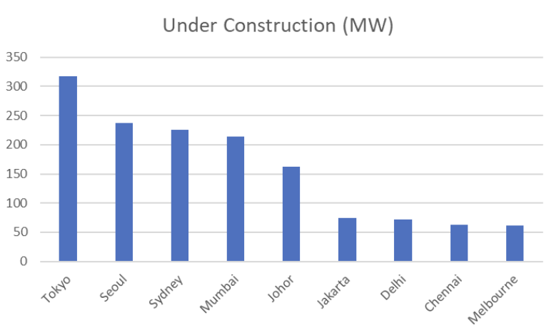 Several core markets across the greater APAC region have over 50 MW under construction, with growing areas such as Mumbai and Johor rapidly joining more established cities such as Tokyo, Seoul, and Sydney.